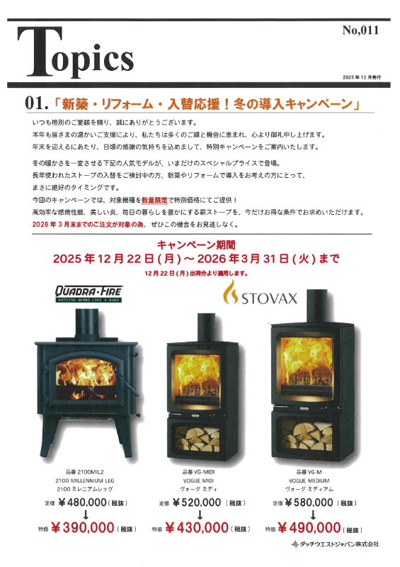 新築・リフォーム・入れ替え応援!冬の導入キャンペーン(2026年3月31日まで) 投稿日 2025年12月23日2025年12月23日 薪ストーブ冬の導入キャンペーン! 数量限定で対象の薪ストーブが特価に!! この機会に検討いかかでしょうか。 富山の薪ストーブ・ペレットストーブ専門店 ヒノネ